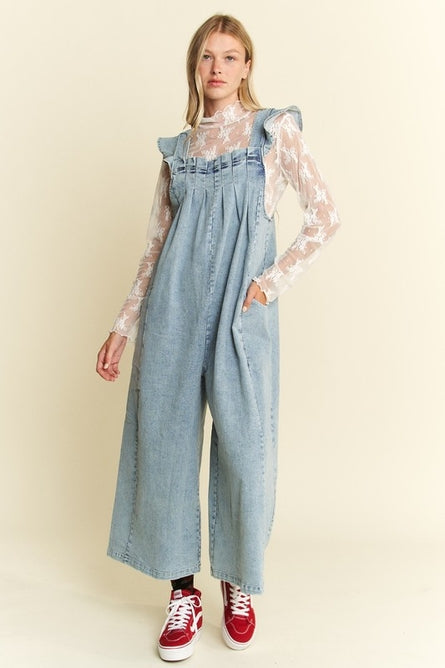 This denim jumpsuit features a sophisticated square neckline and delicate flutter sleeves, offering a flattering silhouette with a touch of femininity. Expertly crafted with subtle pin tuck detailing, it enhances structure while maintaining comfort. Perfect for versatile styling, this piece combines classic denim durability with refined design elements for a polished yet effortless look.